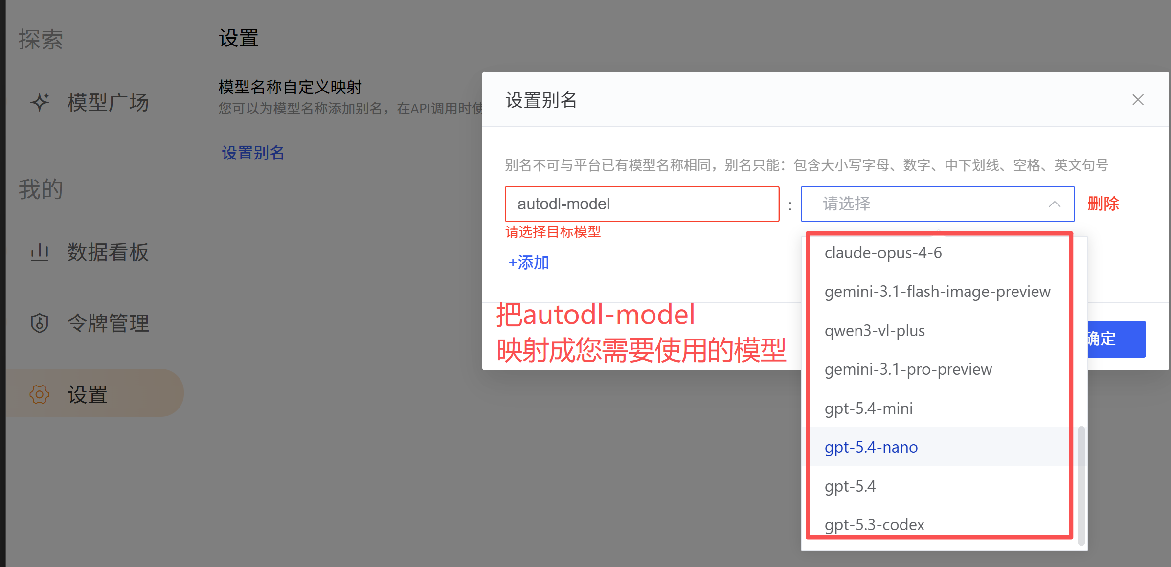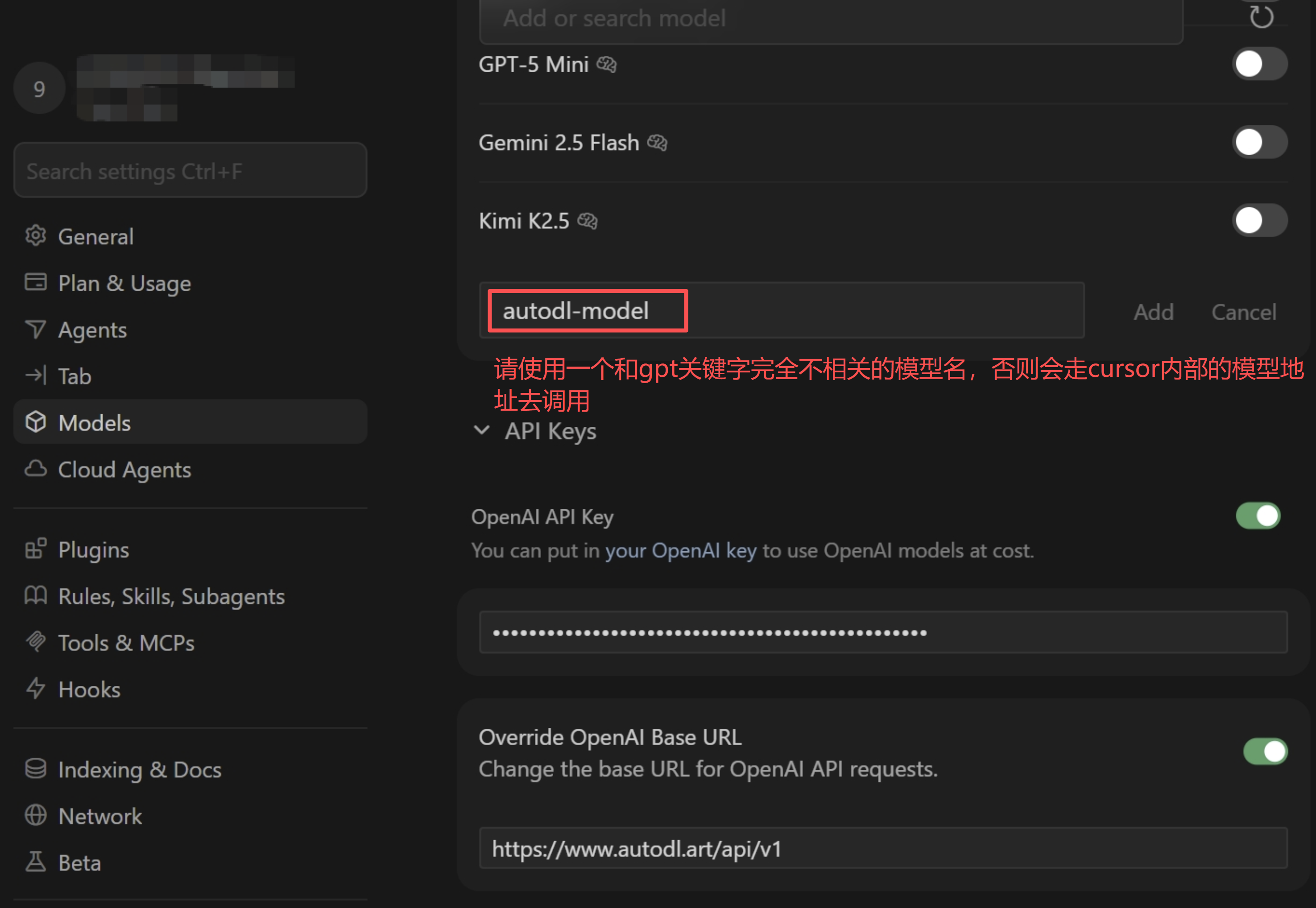在使用Cursor模型时,请按以下截图中所示配置:模型名称、API Key和Base URL。这里需要注意的是如果您使用的模型名称与Cursor中已经存在的模型名关键字有重合(模糊匹配),那么Cursor会走自己内置模型对应的URL地址来调用模型。比如您添加的模型名为:gpt 5.4,可能会被匹配为内置的GPT-5。因此建议自定义模型名时请填写和Cursor默认模型完全无关联的模型名,比如autodl-model,这里使用autodl-model模型后,请在www.AutoDL.art 大模型→设置页面添加一个模型名称映射,将autodl-model映射为AutoDL中存在的模型,从而绕开Cursor的内部模型名模糊匹配的逻辑。